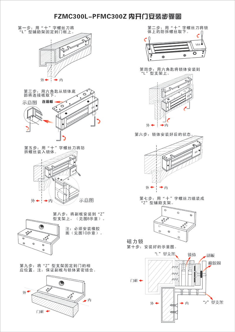 PLMC300磁力锁辅助支架与PZMC270-300磁力锁辅助支架配合使用,配套MC300H 、MC300L磁力锁,应用于90度内开的内推门,实现出入口的控制与管理。