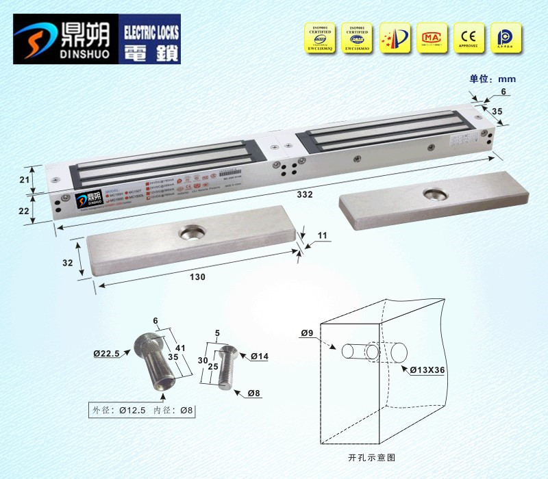 B、适用范围:DS-S-MC150D磁力锁应用于花园与小区出入口,适用于外开门、内开门(配套DS-S-PLMC150D辅助支架与DS-S-PZMC150辅助支架)与未包边的玻璃门(配套DS-S-PUMC150辅助支架实现90度外开门)。DS-S-MC150D磁力锁适用范围:单门结构的金属门、木门、不锈钢门、防火门、消防门等。