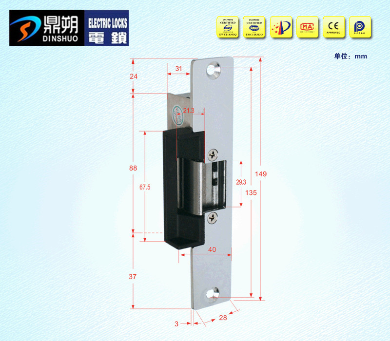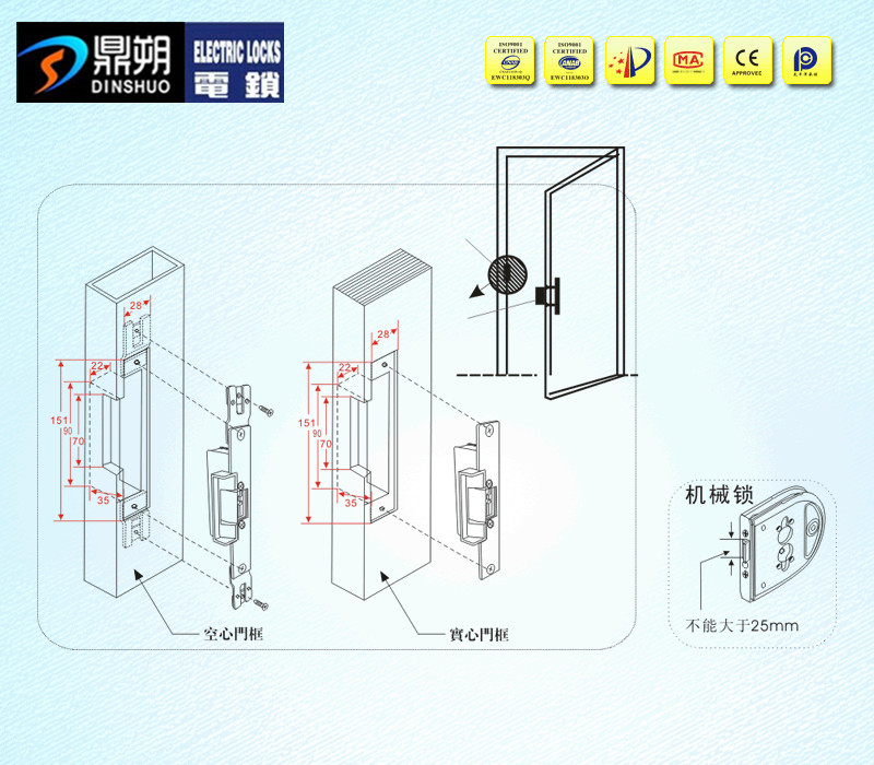 搭配机械锁配套使用,实现控制与手动开启门工作模式。 断电上锁、通电开锁,保障财产,配套机械锁使用,在紧急情况下,可通过机械锁打开,满足消防要求。