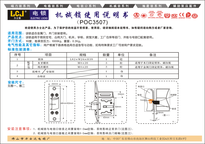 此款单机械锁舌广泛应用于各种有框门;与电锁口配套使用于门禁系统、楼宇系统